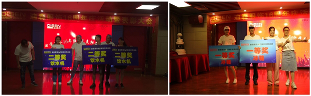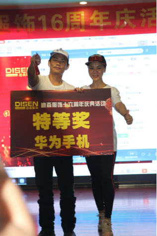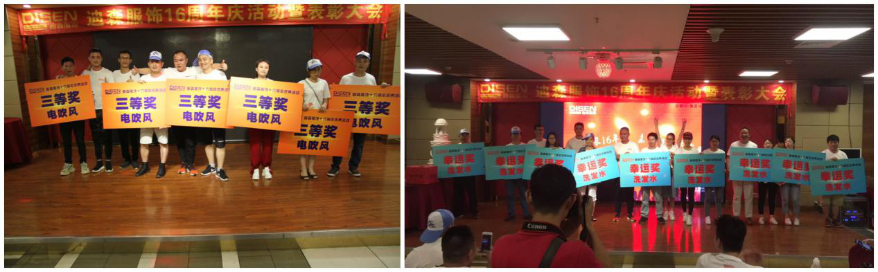 晚宴期間由迪森公司總經理與副總經理開香檳,切蛋糕,慶祝我們周年慶晚宴正式開始,其中感謝(牛仔車間-謝善津、休閑車間-謝均、王磊,技術質量部-郭永福,計劃運營部-黃桂萍、卿偉豪、總經辦吳道望/研發部王瑩)以上同事給迪森家人們帶來精彩的演出,精彩演出的同時,也少不了迪森各位優秀團隊與優秀員工的榮譽稱號和恭喜22位幸運兒在抽獎環節抽到豐厚的禮品。